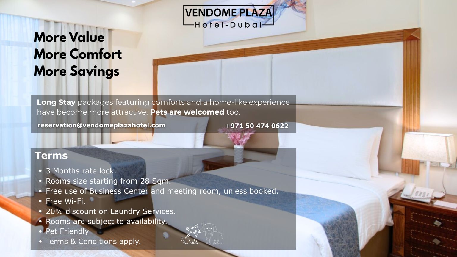 You have your stay covered with us as you enter our hotel. Located in the heart of Deira, where you just relax, stay, and simply get entertained. Enjoy your stay, treat yourself to breakfast at our Vendome restaurant, and get ready to break a leg! With 6 room categories, 8 entertainment hubs and ever ready service at your fingertips. We have got your stay covered, walk in, relax, and let the entertainment begin.